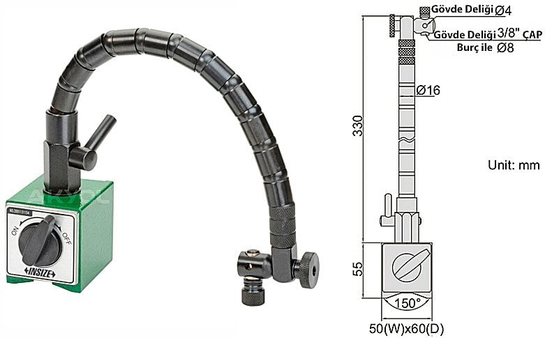 Insize 6207-80A Bükülebilir Kollu Manyetik Stand, hassas ölçüm işlemlerinde yüksek stabilite ve esnek kullanım sunmak için tasarlanmıştır.
