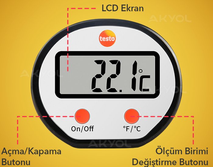 - Testo üstten göstermeli mini termometre cihazı 1 adet LR44 pil ile çalışmaktadır.