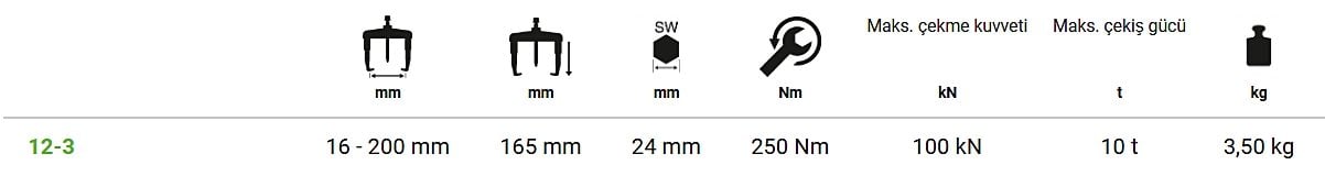 Rulman, dişli, kasnak ve benzeri sıkı geçmiş parçaların güvenli ve kontrollü şekilde sökülmesi için geliştirilmiş profesyonel ve ağır hizmet tipi bir çözümdür. 200-165 mm çalışma aralığı sayesinde otomotivden sanayi bakımına kadar geniş bir kullanım alanı sunar.