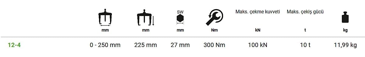Rulman, dişli, kasnak ve benzeri sıkı geçmiş parçaların güvenli ve kontrollü şekilde sökülmesi için geliştirilmiş profesyonel ve ağır hizmet tipi bir çözümdür. 250-225 mm çalışma aralığı sayesinde otomotivden sanayi bakımına kadar geniş bir kullanım alanı sunar.