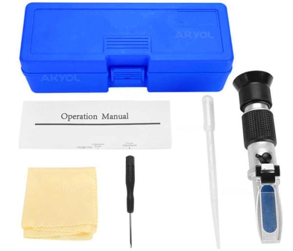 - Refraktometrenin yanında gelen aksesuarları; kalibrasyon sıvısı, sert taşıma kutusu, kalibrasyon ayarı için küçük tornavida, plastik damlalık, temizlik bezi ve kullanma kılavuzudur.